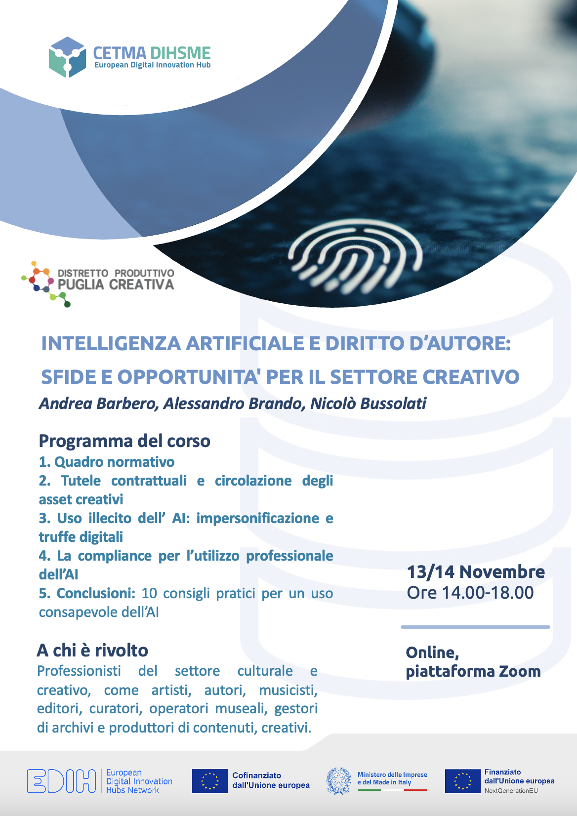 Pensato per professionisti del settore culturale e creativo — come artisti, autori, musicisti, editori, curatori, operatori museali, organizzatori di eventi, gestori di archivi e biblioteche digitali, produttori di contenuti e creativi digitali — il percorso formativo fornisce competenze concrete per comprendere e gestire il rapporto tra IA e diritto d’autore, la tutela della proprietà intellettuale, l’uso responsabile dei dati e le implicazioni etiche delle tecnologie emergenti.
